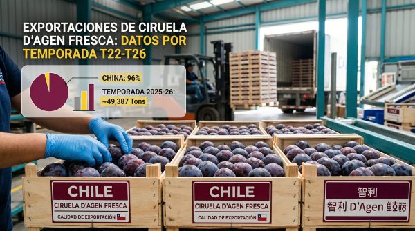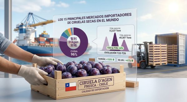 Byadminmarzo 24, 2026Chile exportó 49.387 toneladas de Ciruela D'Agen fresca en T26, con China recibiendo el 96% de los envíos. Taiwán creció +153% y EE.UU....